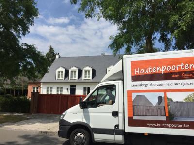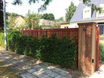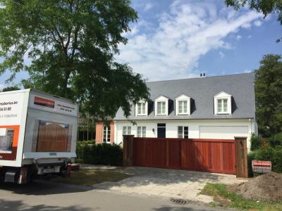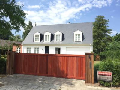 Schuifpoorttype Cor Beng uit padouk met twee colonnes. In één colonne zit een brievenbus verwerkt en een leverluikje voor pakjes.
